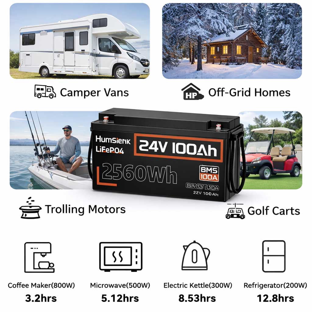 - 12V серія: 8Ah, 12Ah, 20Ah, 100Ah (Group 24, Mini), 310Ah — для RV, сонячних систем, тролінгових моторів, кемпінгу, морських застосувань. Ємність до 4.096 kWh у конфігурації 4S4P, вага від 10.5 кг, IP65/IP67 водозахист.