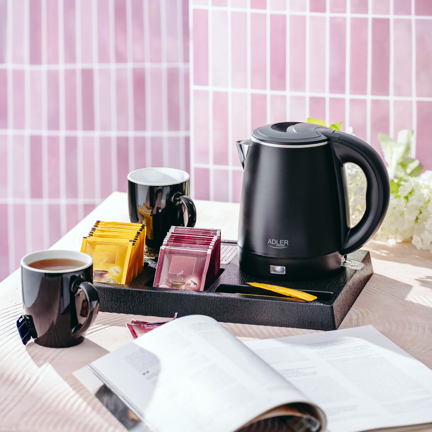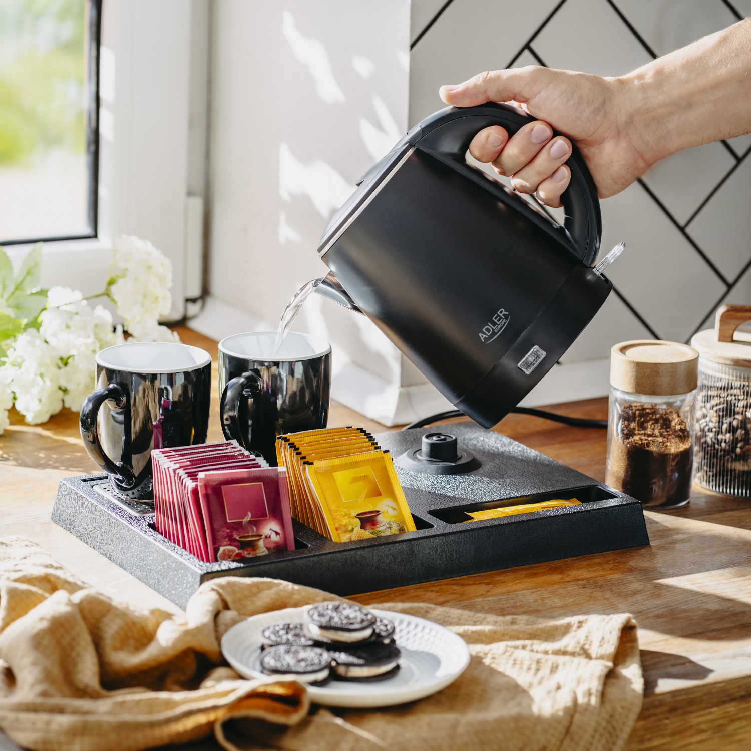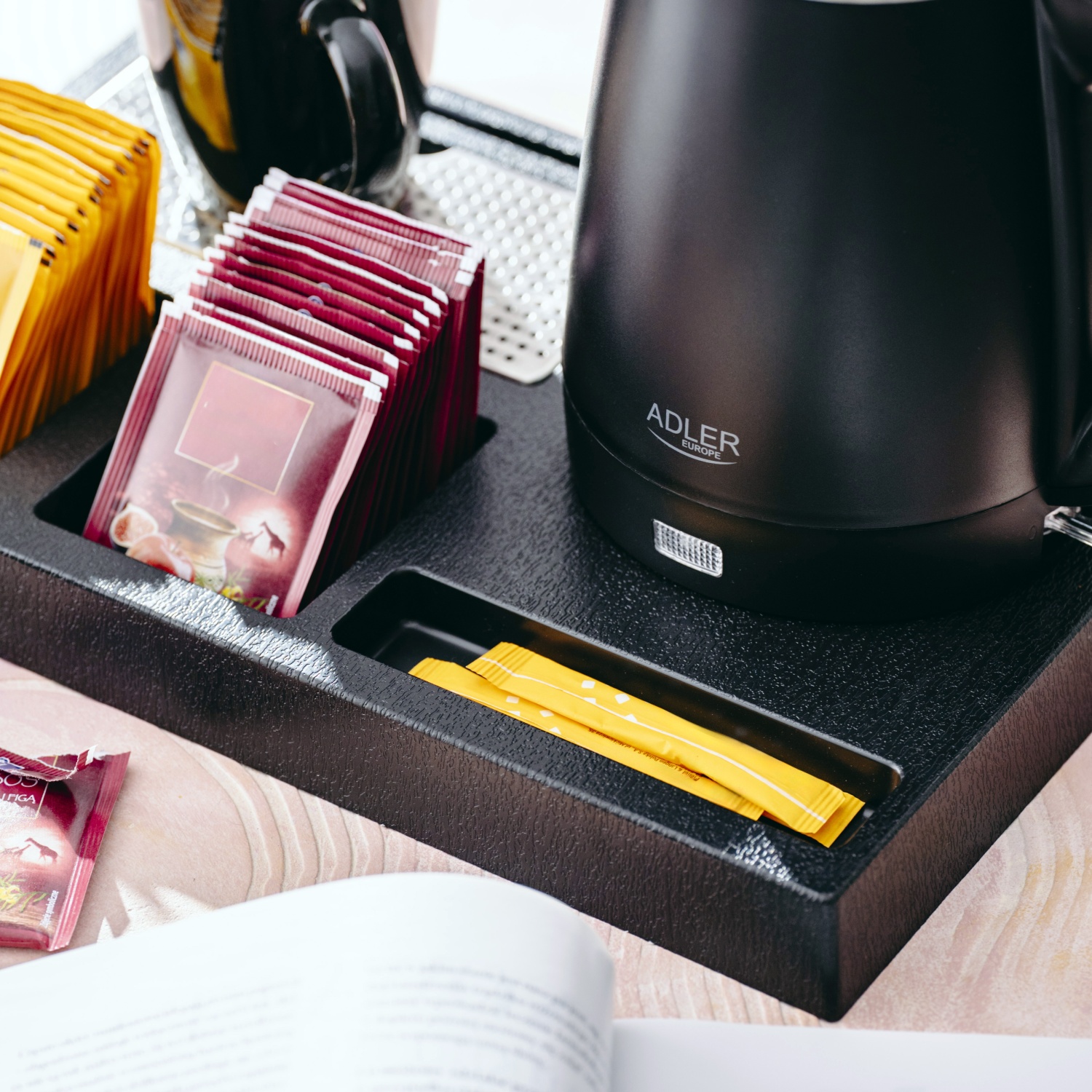 Чайний набір готельний чайник Adler AD 1387 з нержавіючої сталі — це елегантне та практичне рішення для готелів, гостьових будинків та апартаментів. Цей готельний набір для чаю забезпечує гостям зручне приготування гарячих напоїв безпосередньо в номері, поєднуючи стильний дизайн з високим рівнем безпеки та функціональності. Завдяки міцному підносу з ABS-пластику, потужному чайнику з подвійними стінками та якісним керамічним кухлям, чайний набір Adler AD 1387 підносить стандарти сервісу на новий рівень.