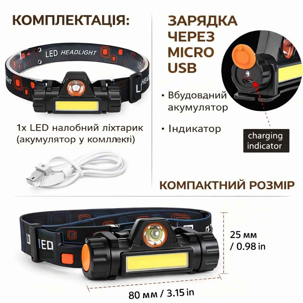 Технічні характеристики налобного ліхтарика COB+LED USB 400mAh