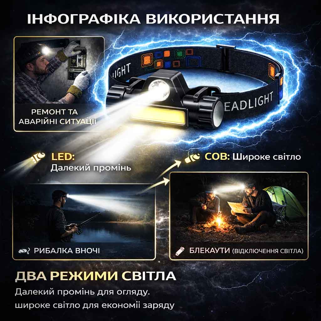 Інструкція з використання налобного ліхтарика COB+LED USB 400mAh