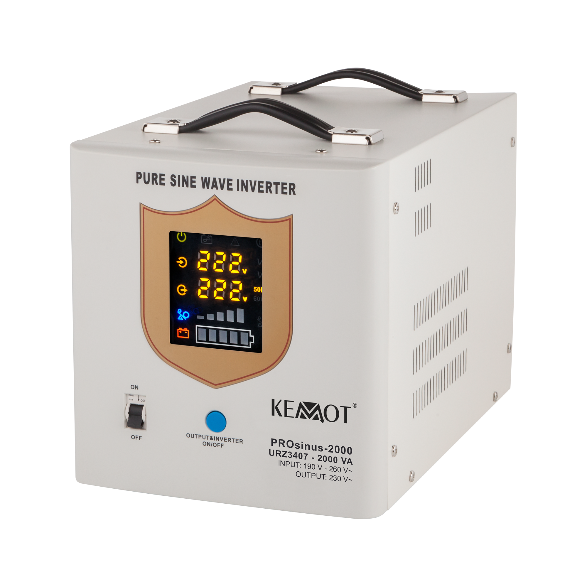 Джерело безперебійного живлення Kemot PROsinus-2000 URZ3407 — потужний гібридний інвертор з чистою синусоїдою (2000 ВА / 1200 Вт), який забезпечує надійне аварійне живлення під час відключень електроенергії.
