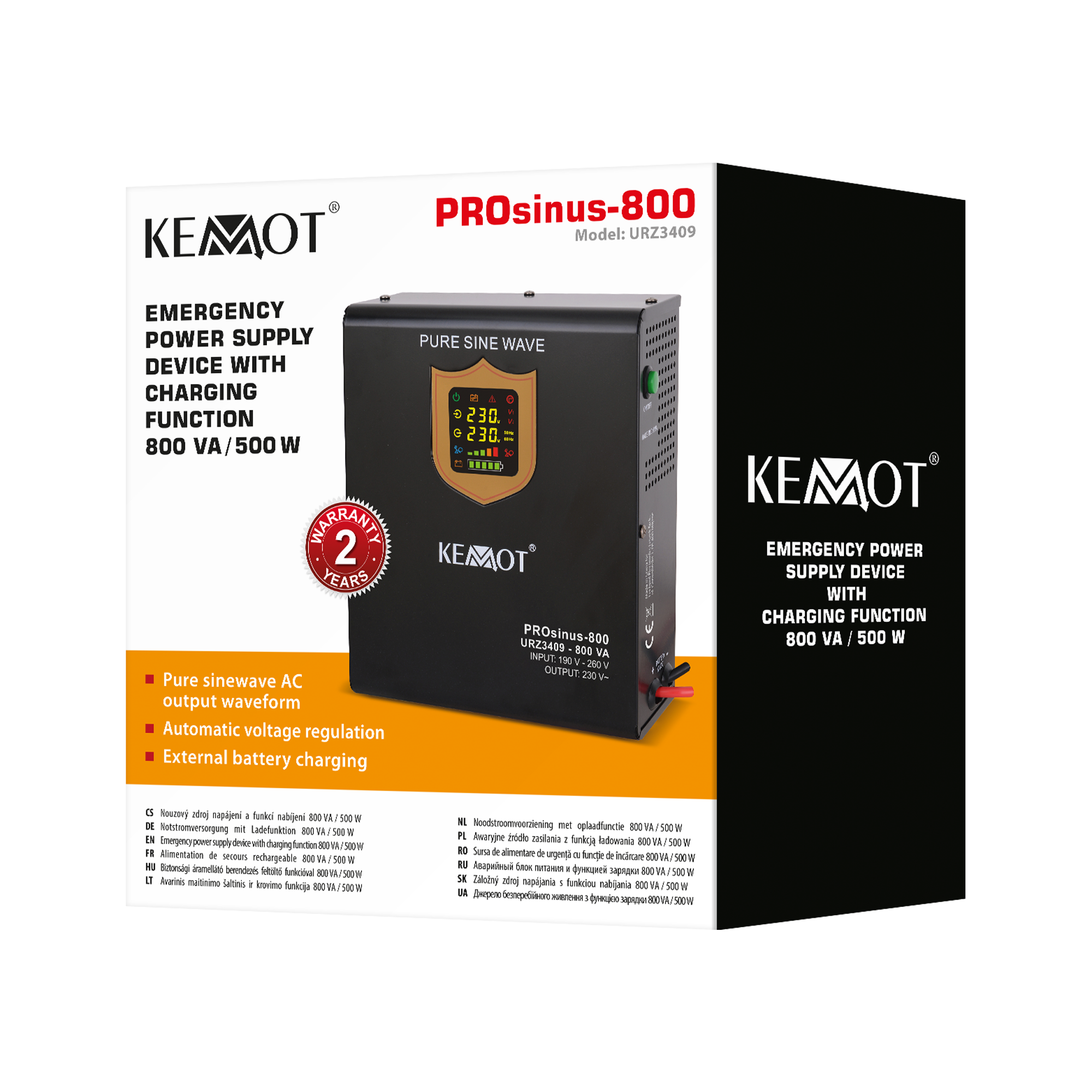 Kemot PROsinus-800W URZ3409 — надійне джерело безперебійного живлення з чистою синусоїдою, призначене для захисту газових котлів, насосів опалення, побутової техніки та електроніки під час відключень електроенергії. Забезпечує стабільну напругу 230 В і сумісний з чутливими індуктивними навантаженнями.