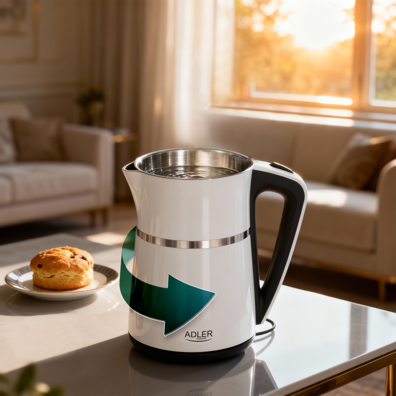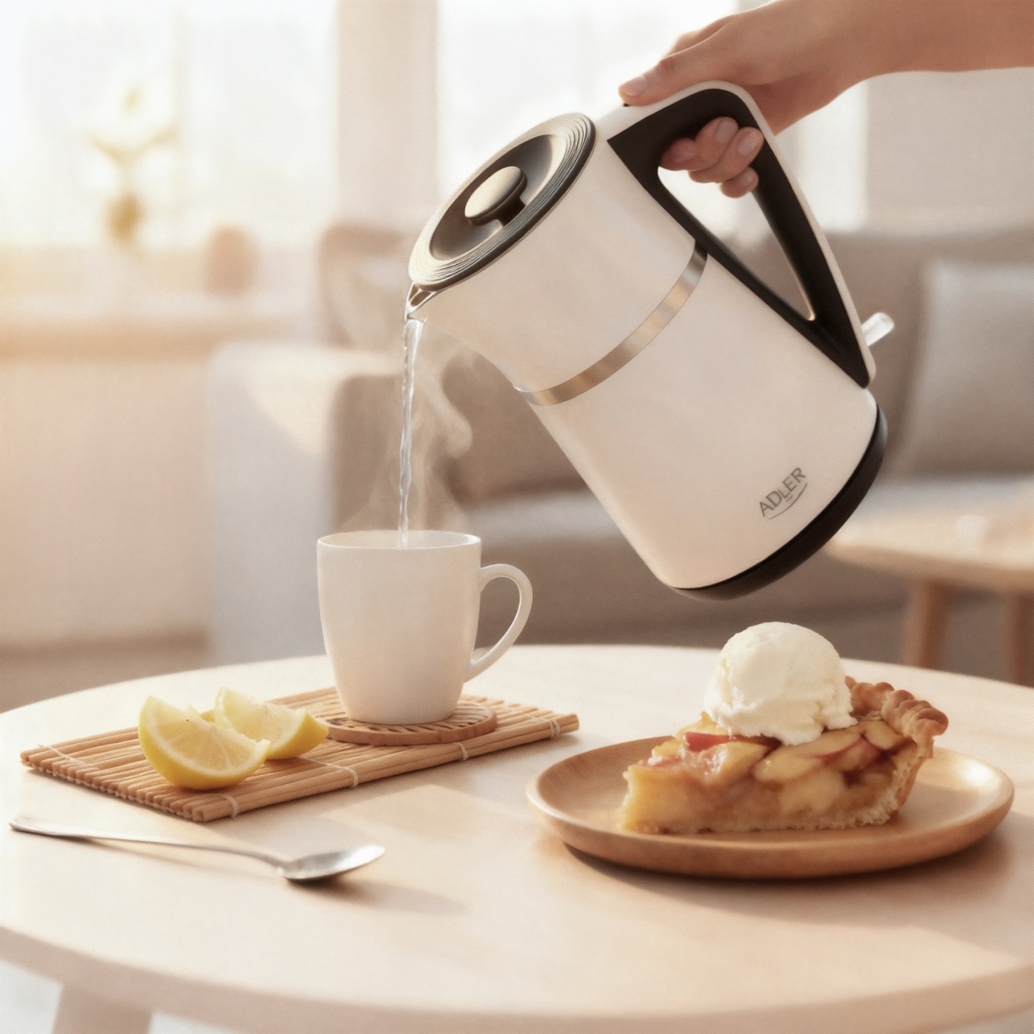 Електричний чайник Adler AD 1355 оснащений подвійним захистом: автоматичним вимкненням та термозапобіжником. Подвійні стінки роблять зовнішню поверхню безпечною для дотику, ідеально для сімей з дітьми. Завжди перевіряйте наявність води перед увімкненням.