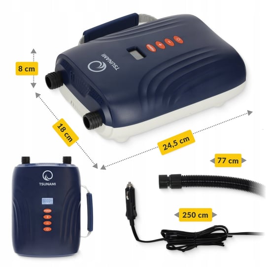 Електричний насос для SUP-дошки TSUNAMI CAR DAP-01 зі змінними наконечниками – це потужний, компактний та універсальний пристрій для швидкого надування SUP-дощок та інших надувних виробів. Завдяки живленню від автомобільного прикурювача 12V, насос ідеально підходить для подорожей, відпочинку на морі, озері або річці.