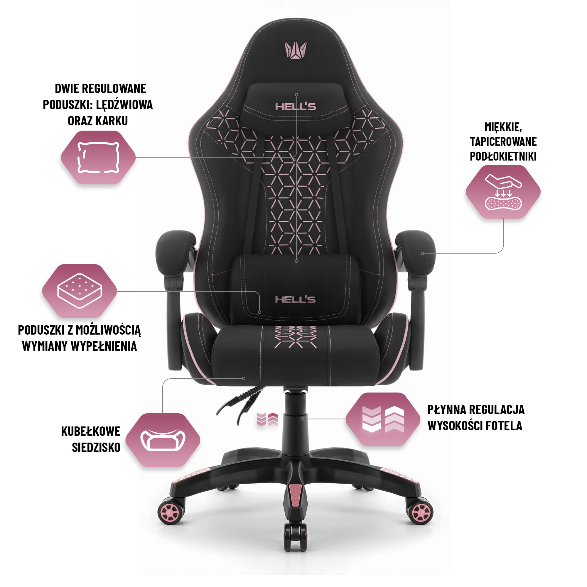 Геймерське крісло Hell’s Chair HC-1008 Black Pink 2.0 – стильне чорно-рожеве ігрове крісло з дихаючої тканини HD та сітки. Ергономічне ковшеподібне сидіння, регульовані поперекова й шийна подушки, механізм гойдання, газліфт 4 класу SGS, міцна нейлонова база. Максимальне навантаження 150 кг, рекомендований зріст 160–180 см. Ідеально для тривалих ігрових сесій, роботи та навчання – комфорт і турбота про спину гарантовані!