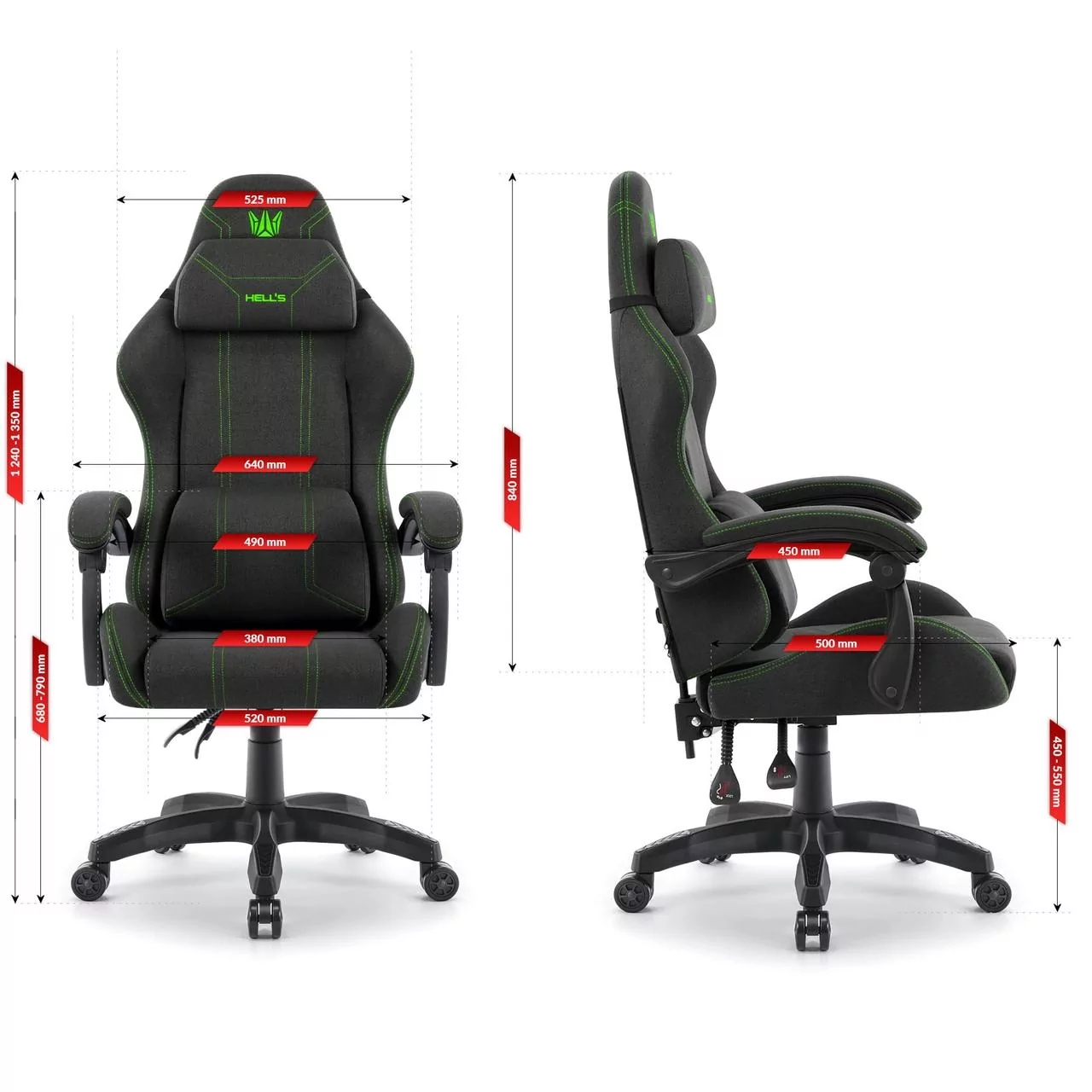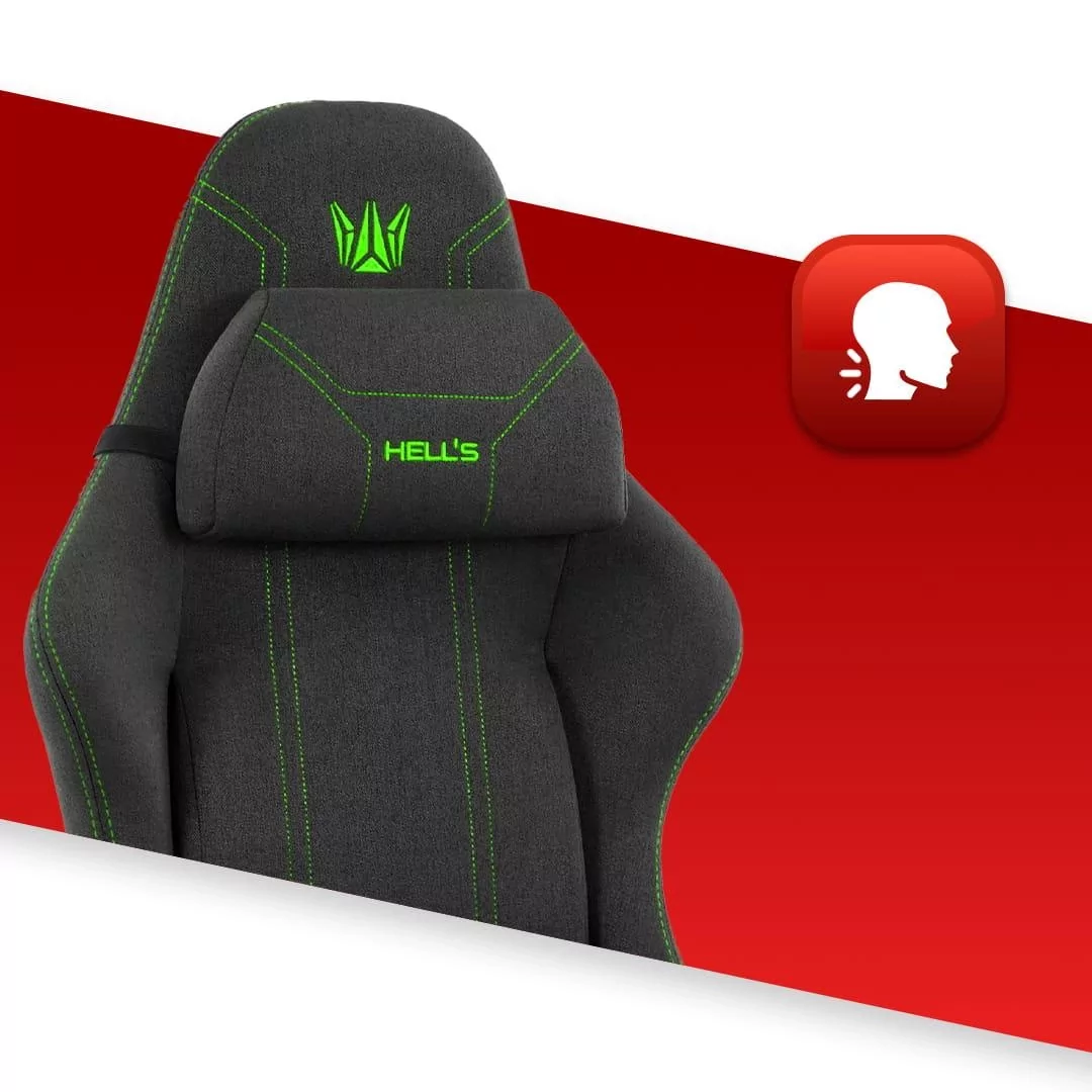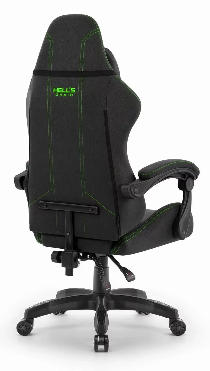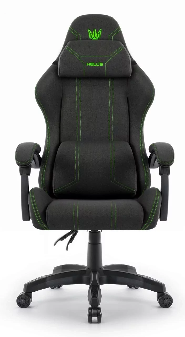 Геймерське крісло Hell’s Chair HC-1014 Black Green тканина – стильне чорно-зелене ігрове крісло з дихаючою тканиною, ергономічним ковшем, знімними поперековою та шийною подушками, плавним нахилом спинки та газліфтом 4 класу (SGS). Максимальне навантаження 120 кг, рекомендований зріст 150–180 см. Ідеально для тривалих ігрових сесій, роботи та навчання. Тихі поліуретанові колеса, міцна нейлонова хрестовина, вага крісла лише 14 кг. Комфорт і крутий дизайн за доступною ціною!