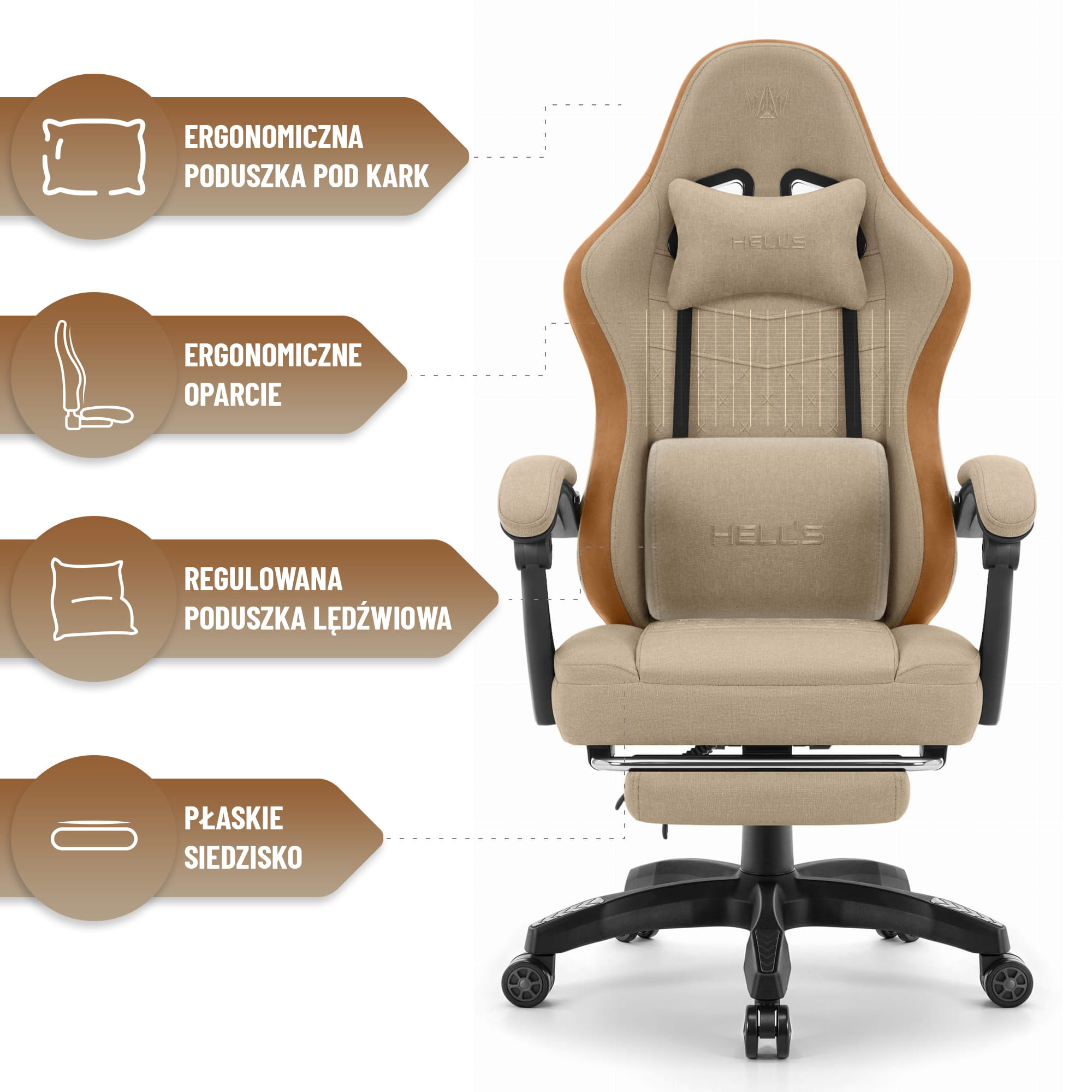 Геймерське комп’ютерне ігрове крісло Hell’s Chair HC-1015 Beige тканина – ергономічне крісло в стильному бежевому кольорі з висувною підставкою для ніг, поперековою подушкою та подушкою для шиї. Виготовлене з дихаючої міцної тканини, механізм гойдання, газліфт 4 класу, тихі колеса. Максимальне навантаження 150 кг. Ідеально для довгих ігрових сесій, роботи та навчання. Комфорт і здоров’я спини гарантовано!
