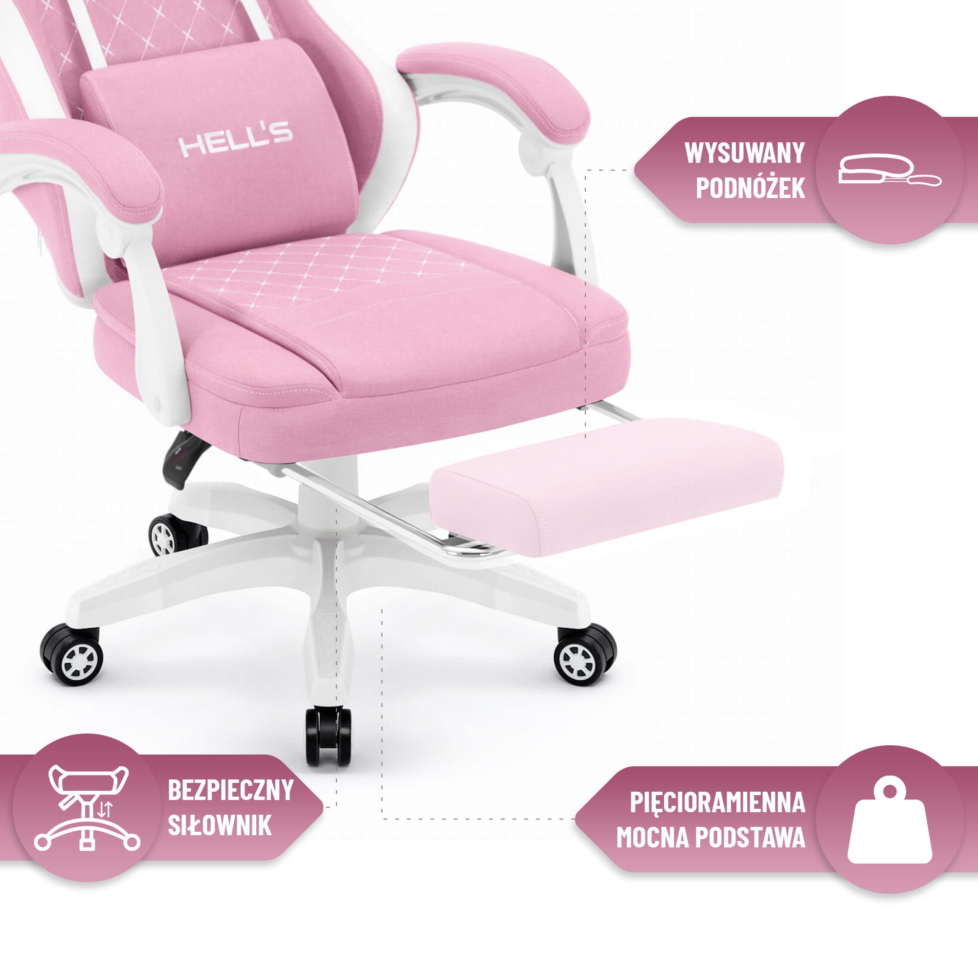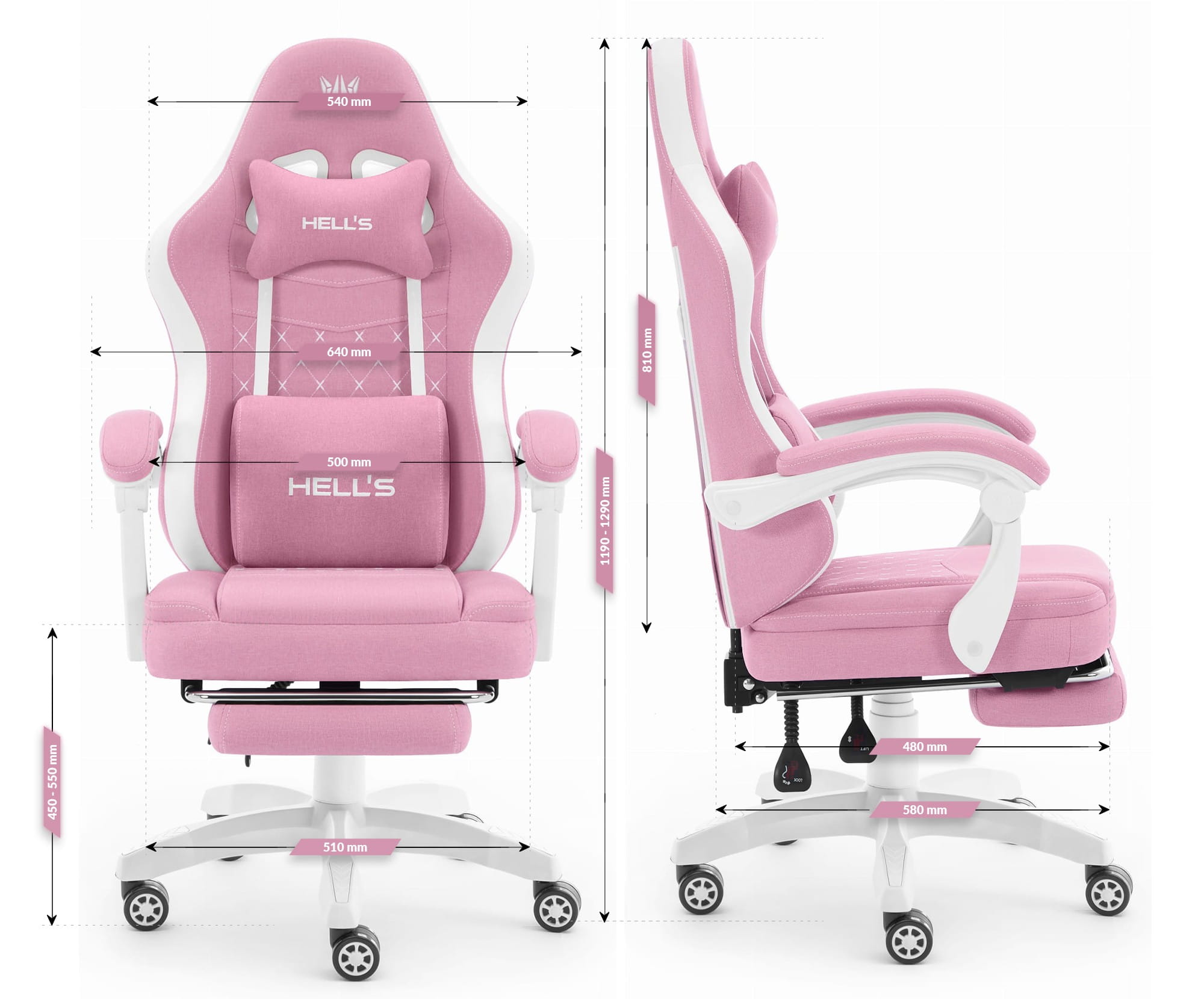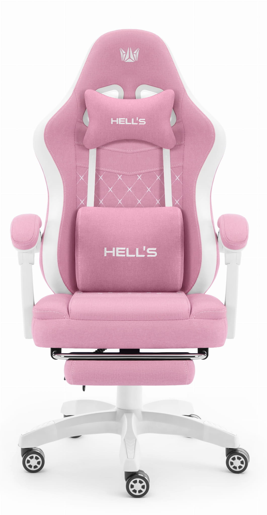 Геймерське крісло Hell’s Chair HC-1015 Pink White тканина – ніжний рожево-білий дизайн для дівчат-геймерок та стримерок. Ергономічна форма, висувна підніжка, поперекова та шийна подушки, регулювання висоти й нахилу спинки до 155°. Міцна тканина, що дихає, м’які підлокітники, тихі поліуретанові колеса. Максимальне навантаження 150 кг, рекомендований зріст 160–180 см. Ідеальний комфорт для довгих ігрових сесій, навчання та роботи!