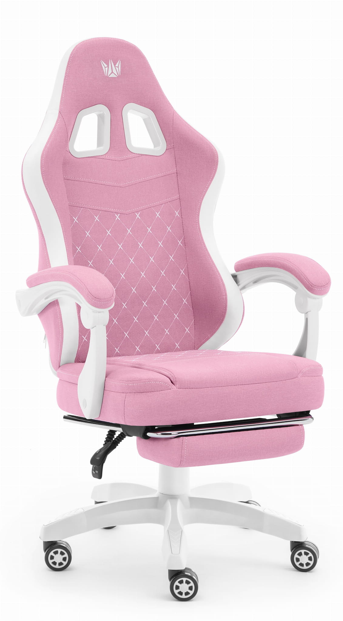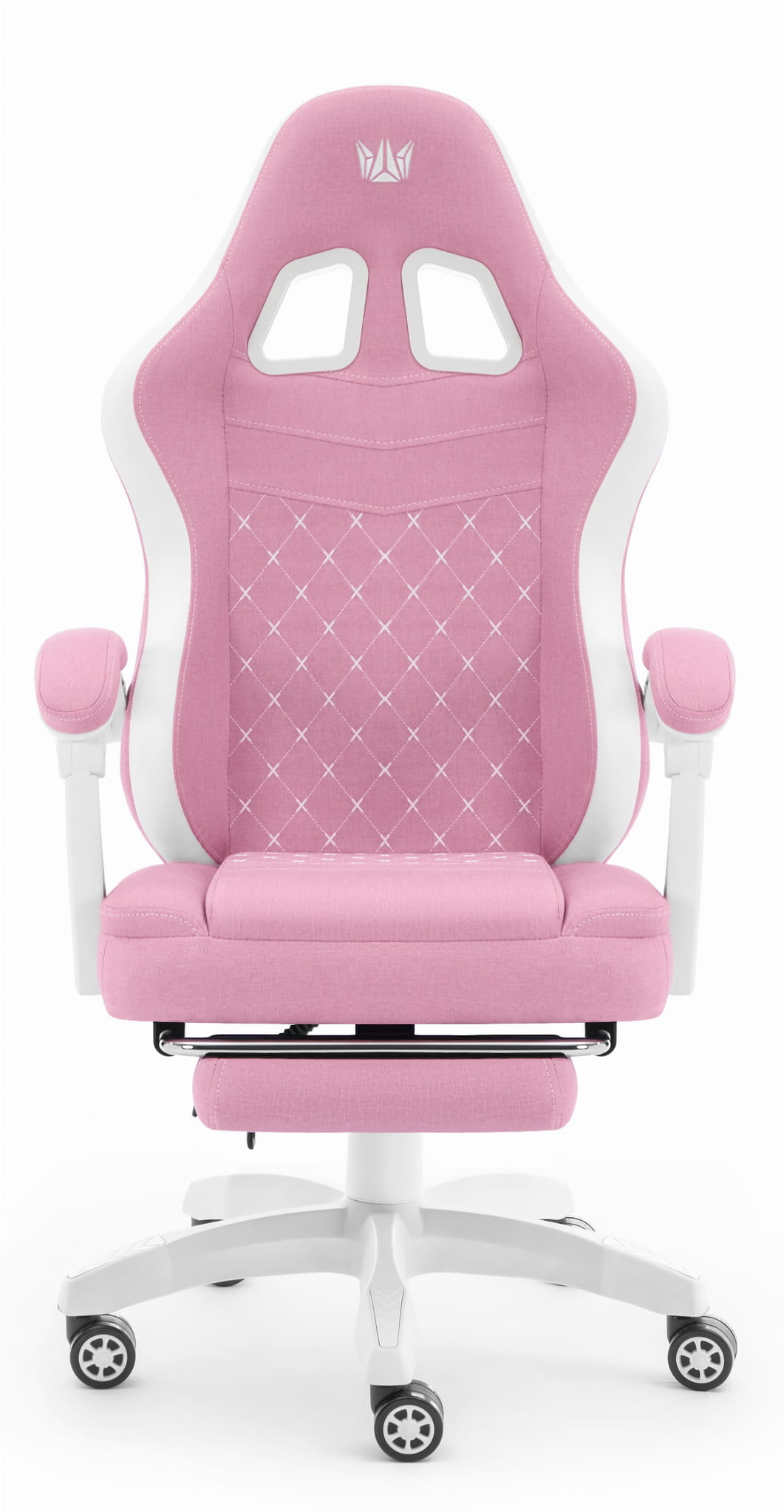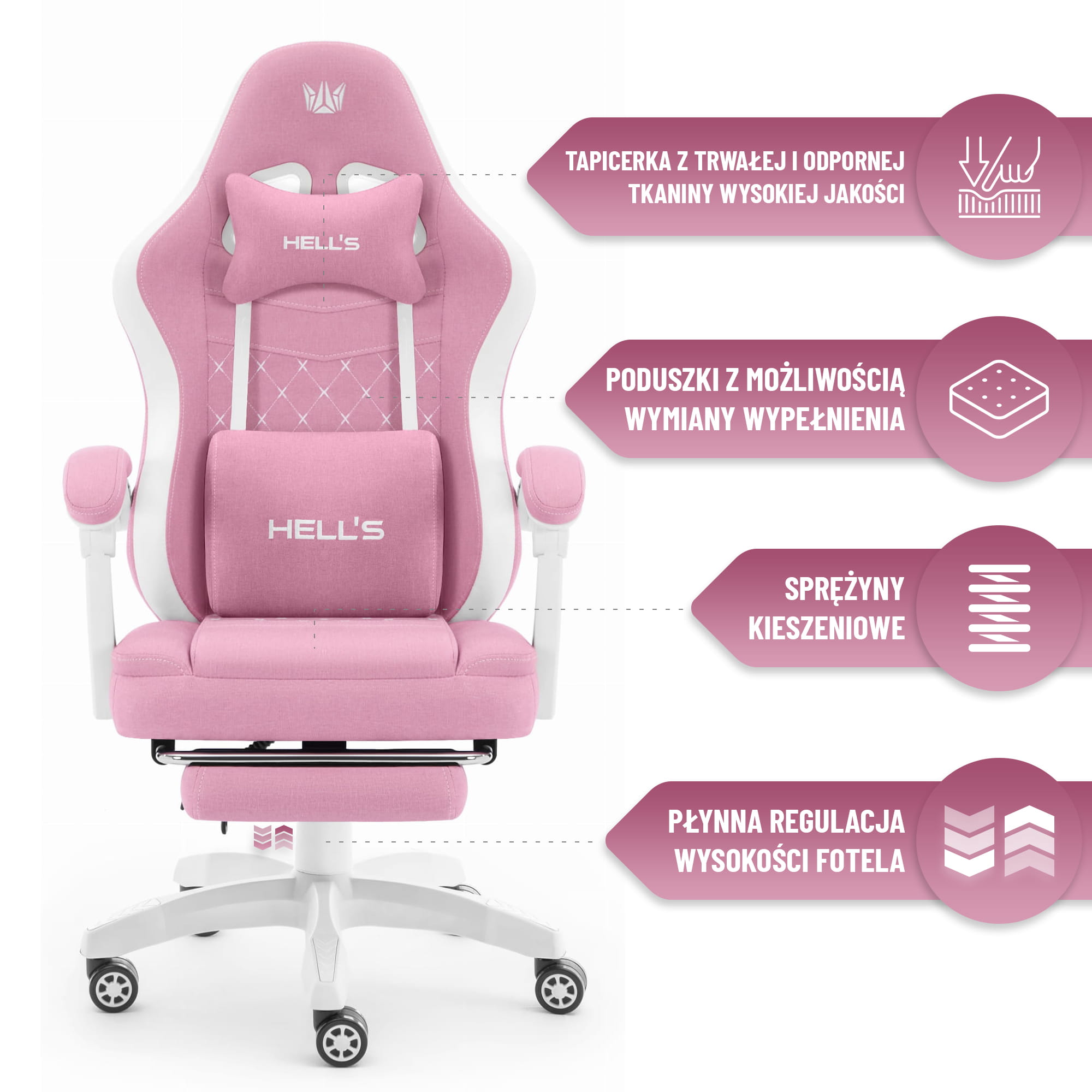 Геймерське крісло Hell’s Chair HC-1015 Pink White тканина – ніжний рожево-білий дизайн для дівчат-геймерок та стримерок. Ергономічна форма, висувна підніжка, поперекова та шийна подушки, регулювання висоти й нахилу спинки до 155°. Міцна тканина, що дихає, м’які підлокітники, тихі поліуретанові колеса. Максимальне навантаження 150 кг, рекомендований зріст 160–180 см. Ідеальний комфорт для довгих ігрових сесій, навчання та роботи!