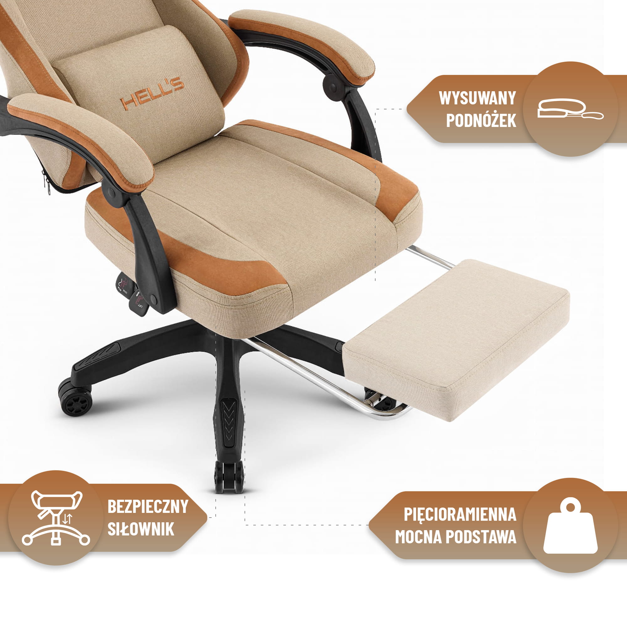 Геймерське комп’ютерне крісло Hell’s Chair HC-1016 Beige — це поєднання ергономіки, преміальних матеріалів та сучасного дизайну. Модель розроблена спеціально для користувачів, які проводять багато часу за комп’ютером: геймерів, офісних працівників, студентів. Дихаюча тканина, м’яке сидіння, висока спинка та висувна підставка для ніг роблять HC-1016 одним із найзручніших рішень у своєму сегменті.