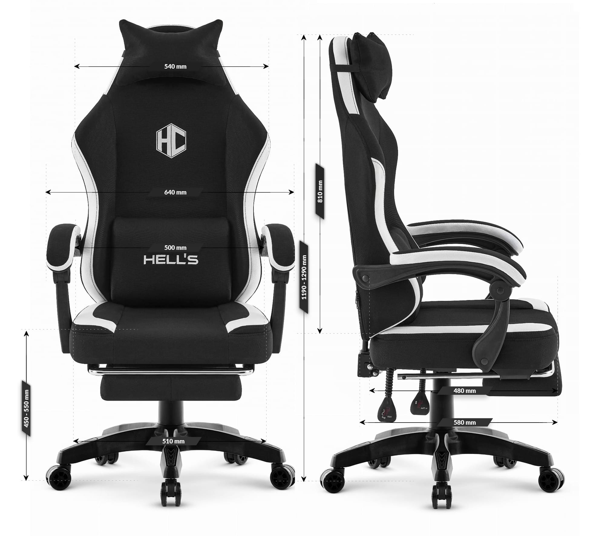Геймерське комп’ютерне крісло Hell’s Chair HC-1016 Black White — ергономічне та стильне крісло з дихаючою тканиною, плоским широким сидінням, високою контурною спинкою та розсувною підставкою для ніг. Забезпечує комфорт під час тривалих ігрових сесій, навчання чи роботи. Міцна п’ятизіркова основа, тихі поліуретанові колеса, регулювання висоти та комплект подушок роблять його ідеальним вибором для користувачів зі зростом 160–180 см.