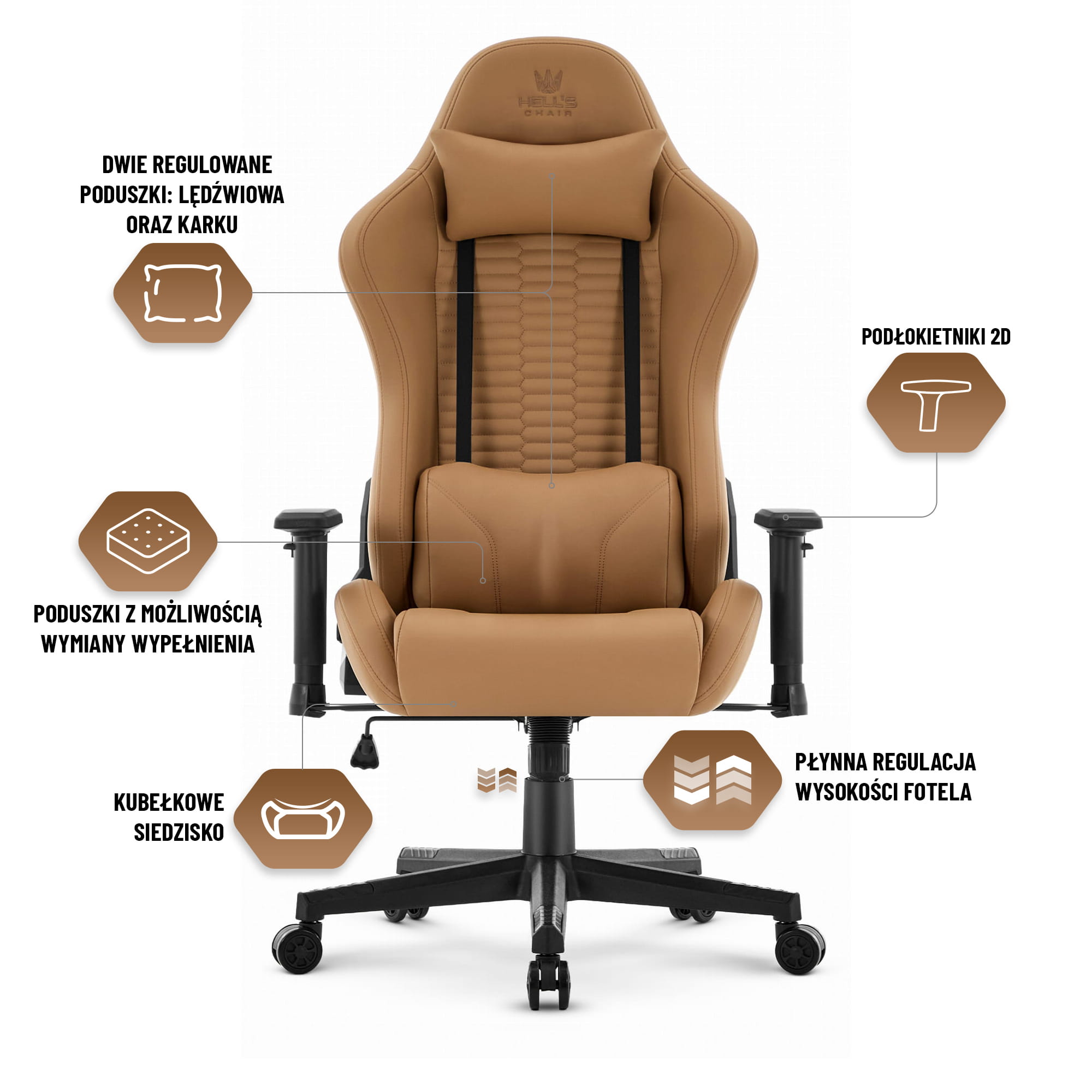 Hell’s Chair HC-2000 Brown – преміальне геймерське крісло з екошкіри коричневого кольору, створене для тих, хто проводить за комп’ютером багато годин щодня. Ергономічна конструкція, подушки з ефектом пам’яті, регулювання у всіх важливих напрямках та стильний дизайн роблять HC-2000 ідеальним вибором для геймерів, стрімерів, програмістів та офісних працівників.