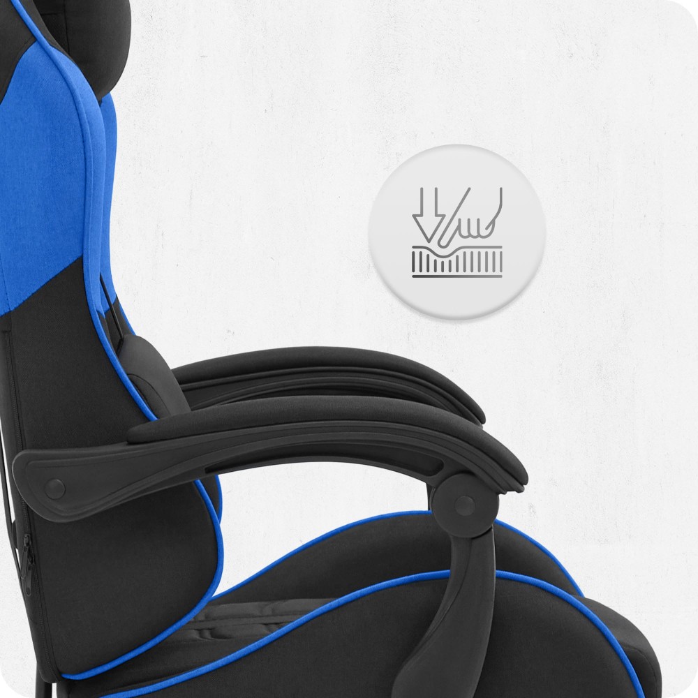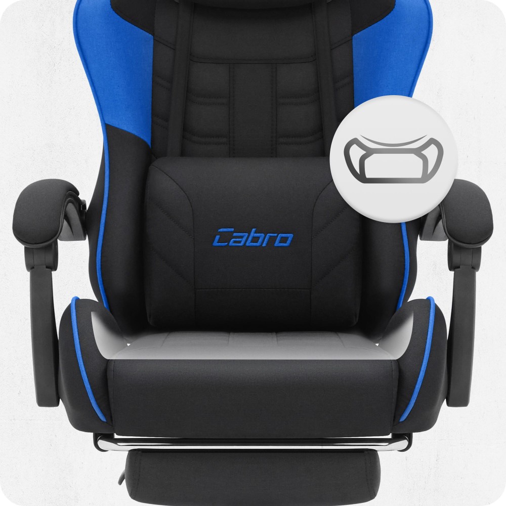 Ігрове крісло Cabro C501 чорно-синє тканина — це ергономічне геймерське крісло, створене для максимального комфорту під час тривалої роботи або гри за комп’ютером. Модель оснащена дихаючою тканинною оббивкою, регульованою спинкою з нахилом до 145°, м’якими подушками для підтримки шиї та попереку, а також висувною підставкою для ніг.