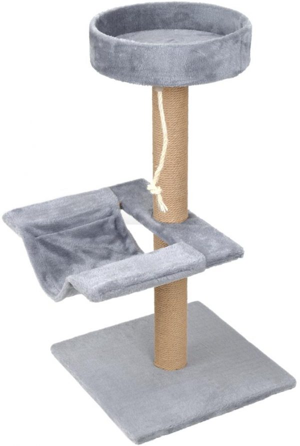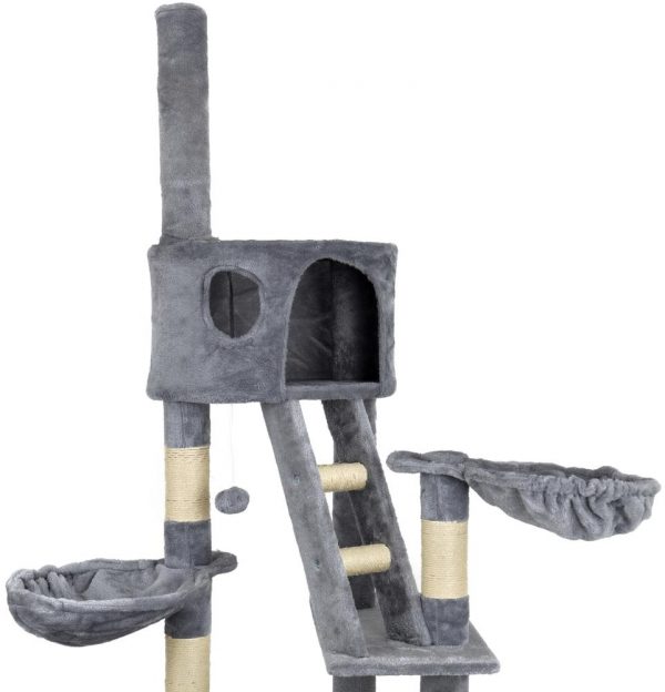 Ця дряпка поєднує в собі затишок і розваги для вашого котика. Модель має будиночок для відпочинку, тераси для огляду та гру, а також м’яке ліжко. Підвісні іграшки та драбина додадуть веселощів, а міцні стовпи, обмотані сизалевою мотузкою, ідеально підходять для точіння кігтів.