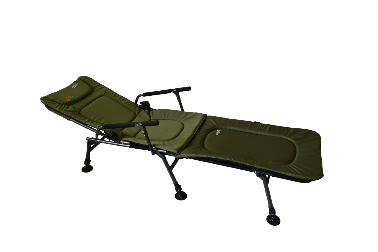 Це рибальське крісло вирізняється універсальністю: воно підходить як для коротких риболовельних сесій, так і для тривалого відпочинку завдяки трансформації в ліжко. Регульовані ніжки дозволяють встановлювати крісло на будь-якій поверхні, а широкі п’яти запобігають просіданню на м’якому ґрунті. Водонепроникна тканина Оксфорд 1200D забезпечує захист від вологи, а легка вага (6 кг без підставки) полегшує транспортування.