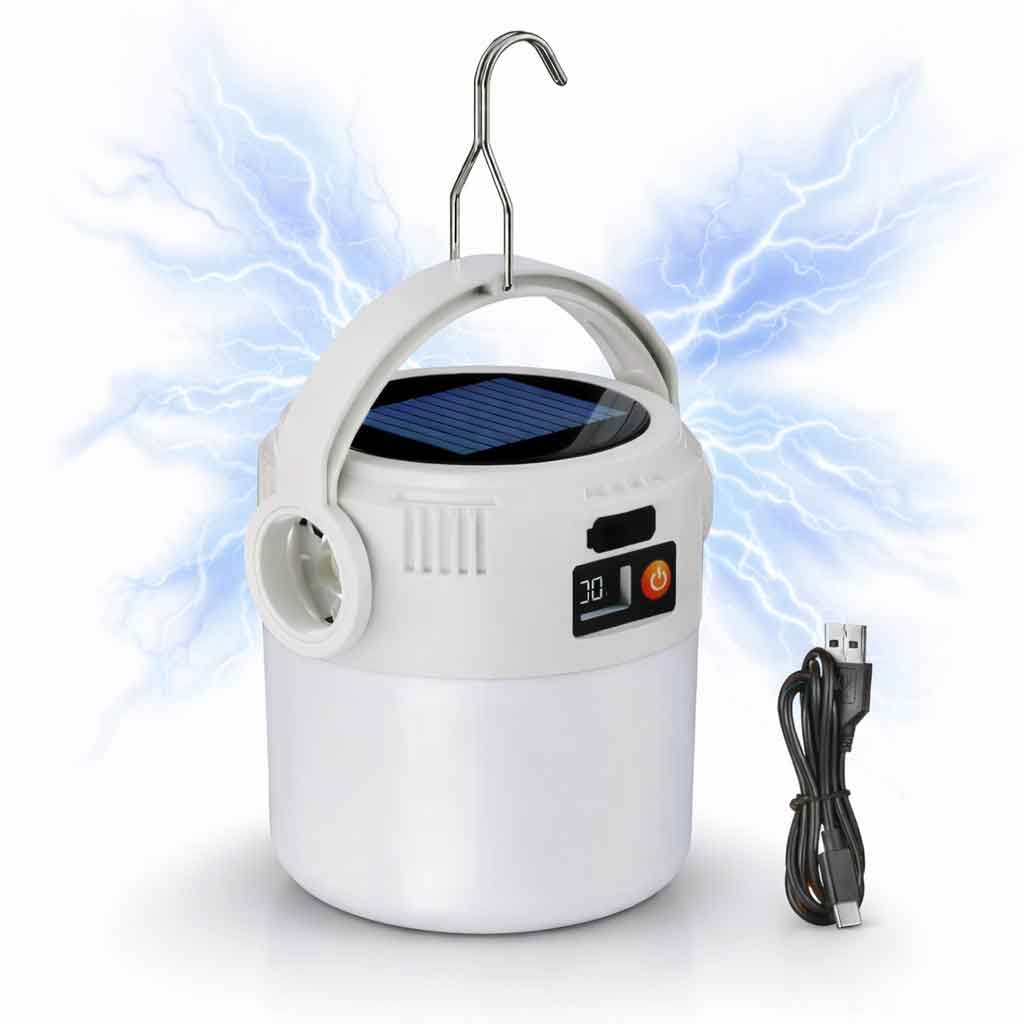 Сонячний кемпінговий ліхтар COB LED SOLAR USB — це сучасний портативний світлодіодний ліхтар для кемпінгу, туризму, риболовлі, аварійного освітлення та щоденного використання вдома. Завдяки поєднанню потужного COB LED-світлодіода, вбудованого акумулятора та можливості заряджання від сонячної панелі або через USB Type-C, пристрій забезпечує стабільне яскраве світло у будь-яких умовах.