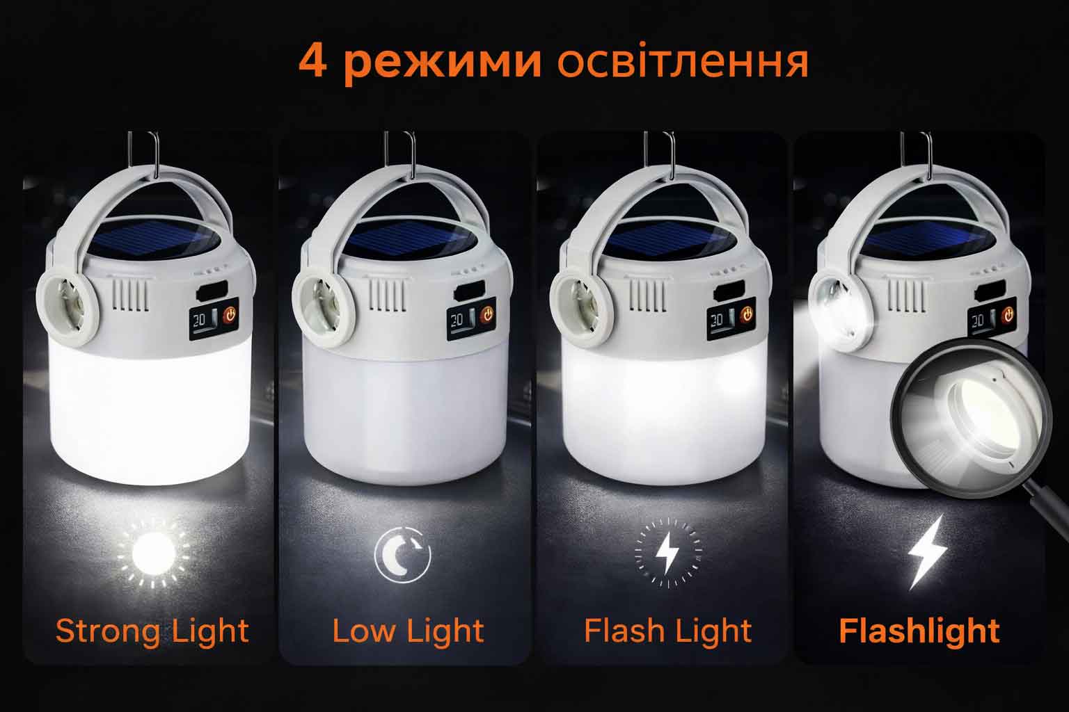 - Освітлення намету, табору або зони відпочинку.